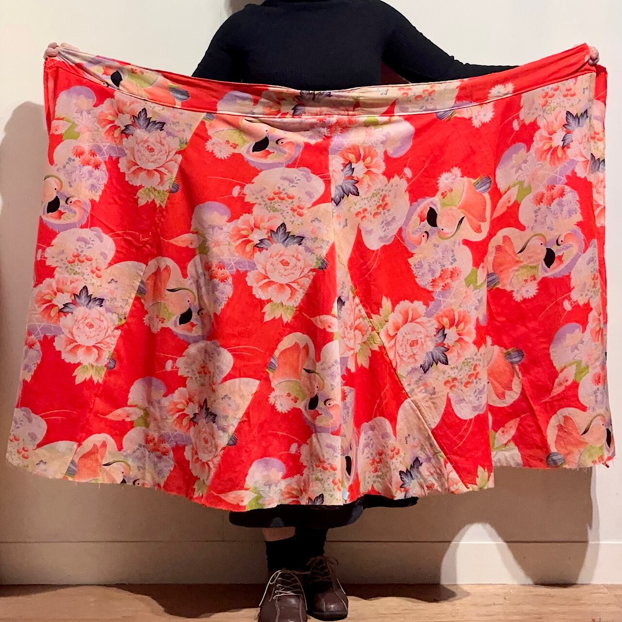 シルクサリーシリーズの「巻きスカート」のデザインをもとに、着物×サリーの巻きスカートを作りました。