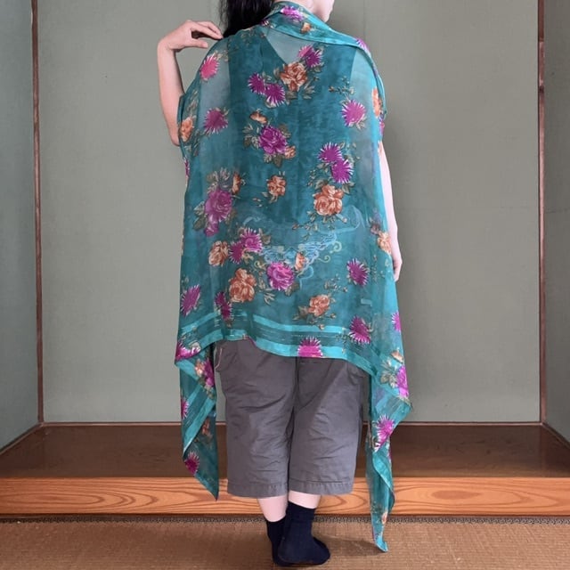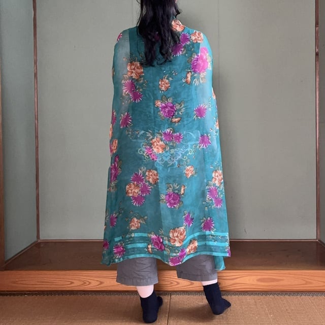 1枚のサリーで仕立てる軽やかなアウターができました。こちらのエメラルド色のシフォン生地のサリーには、端に金糸も織り込まれています。しなやかな中にも心地良い織りの感触がある極上の風合のシルクです。華やかながらもミステリアスで、飽きが来ずずっと使える色味です。