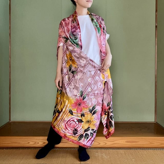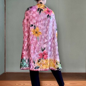 1枚のサリーで仕立てる軽やかなアウターができました。テロンとした滑らかな生地。織のポルカドットの地紋と、大ぶりの花柄が特徴的です。一部、ラメが入っている部分があります。