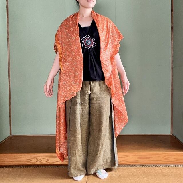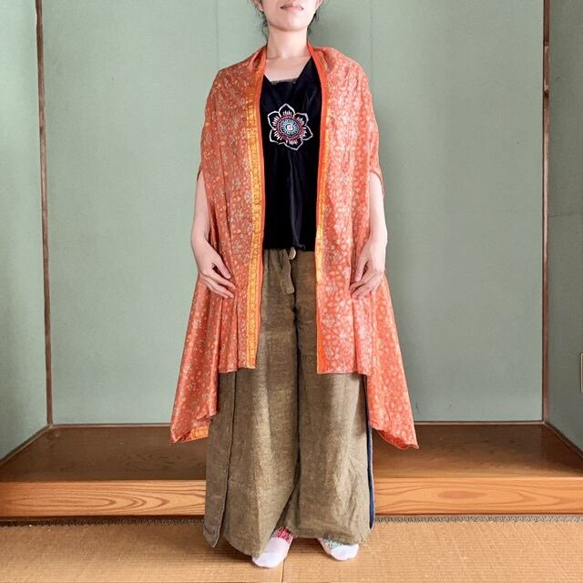 1枚のサリーで仕立てる軽やかなアウターができました。ビタミンカラーのオレンジで明るい気持ちになれそうな、滑らかな肌触りのサリー。ベーシックな伝統柄の小花柄に金色の織テープでフチ取られ、優しい印象です。