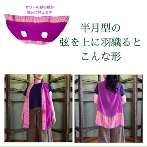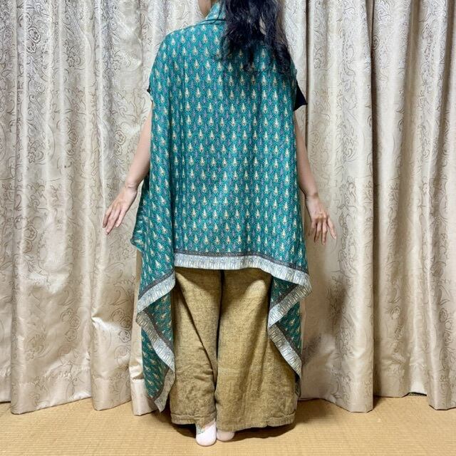 1枚のサリーで仕立てる軽やかなアウターができました。エメラルド色の地にイトスギの柄が並び、リバティプリントのような印象のデザイン。滑らかで柔らかな生地です。