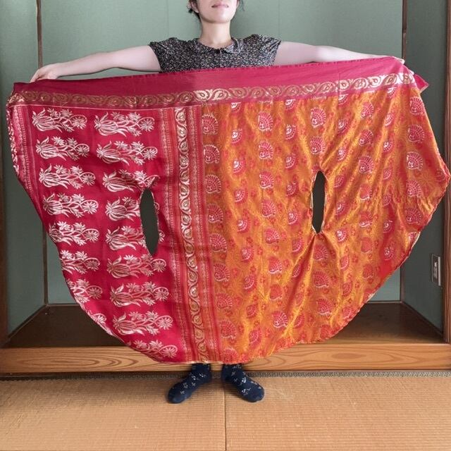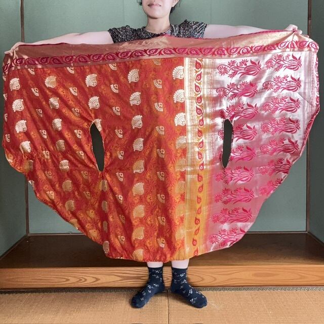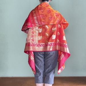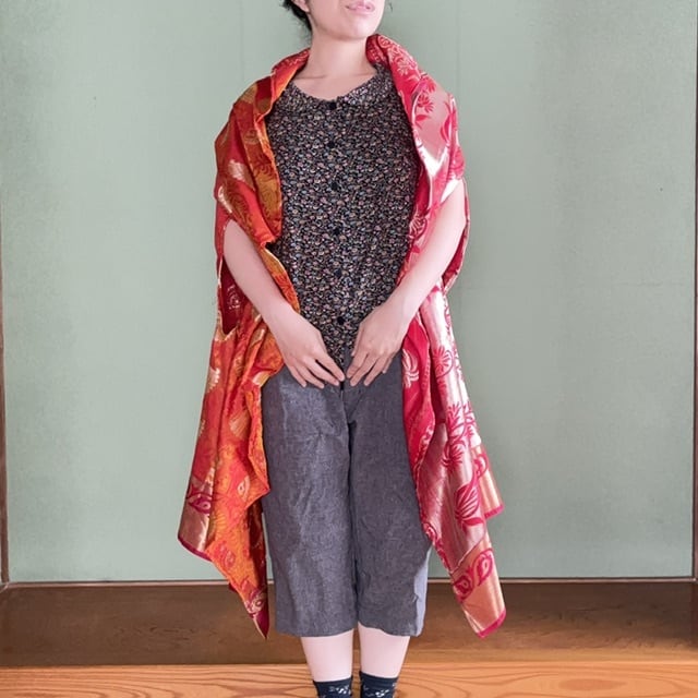 1枚のサリーで仕立てる軽やかなアウターができました。赤・朱色・オレンジ・マゼンタと暖色づくしのサリー。凝った織りの生地で、裏表ともに使えそうです(引っかけ・引っ張りにご注意ください)。