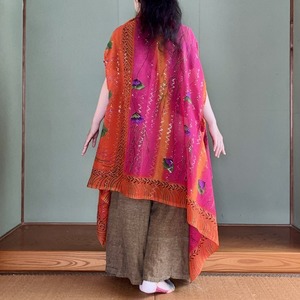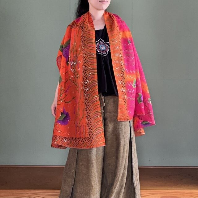 1枚のサリーで仕立てる軽やかなアウターができました。ビビッドなオレンジ色に、大柄な紫の花と、散りばめられたスパンコール。南国の雰囲気が感じられるサリー生地を使いました。