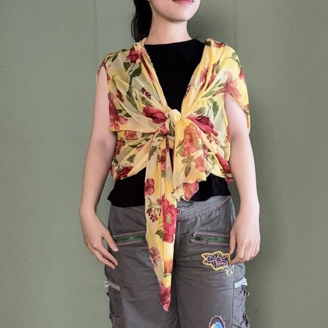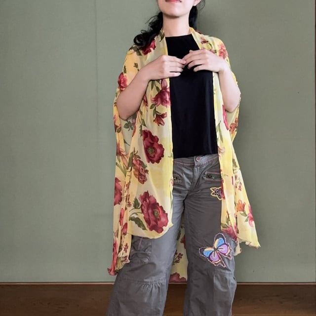 1枚のサリーで仕立てる軽やかなアウターができました。こちらは軽〜く、ふんわりしたシフォンのサリーを使いました。肌触りは優しく柔らかです。しなやかなシフォンで作られた月読はアレンジも自由自在。
