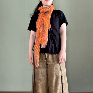 1枚のサリーで仕立てる軽やかなアウターができました。シャリ感のある肌触りのオレンジ色のシフォン生地に、キラキラのラメがちりばめられたサリーを使いました。バイオレット色とミントグリーンの花の色の組み合わせが絶妙です。