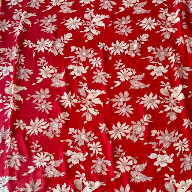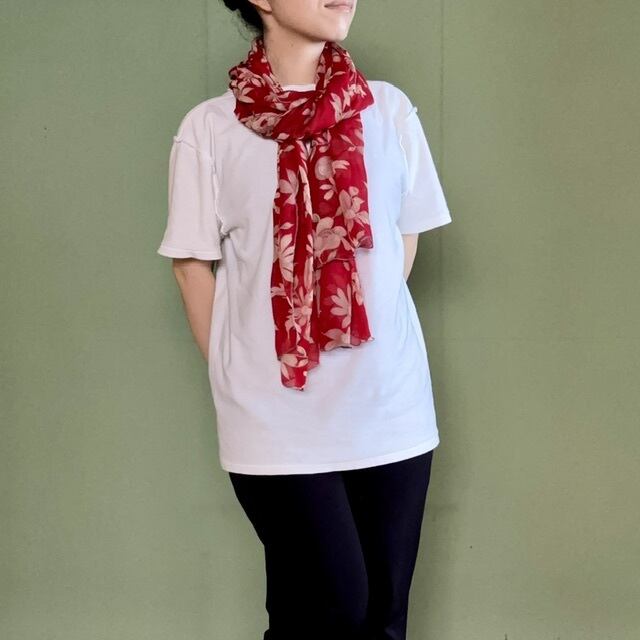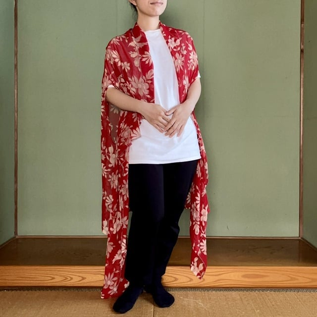 1枚のサリーで仕立てる軽やかなアウターができました。シフォンで作られたお祝い用の赤サリー。数カ所に入ったラメがさらにお祝い気分を盛り上げます。