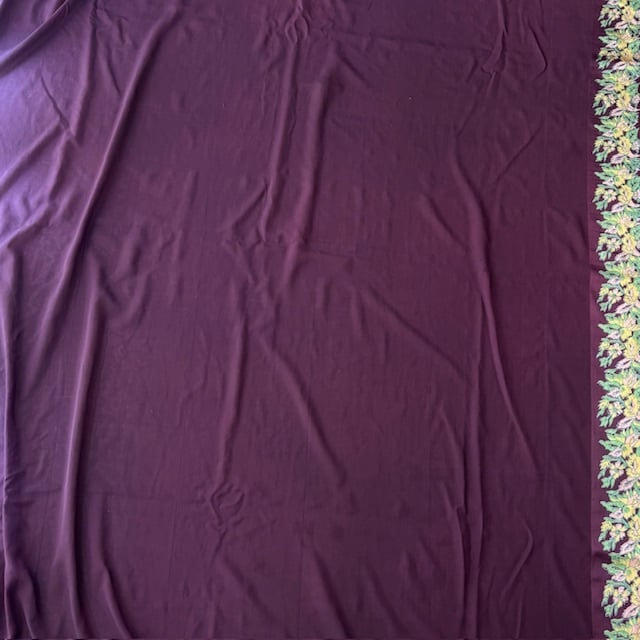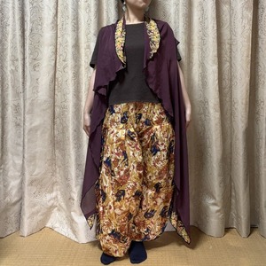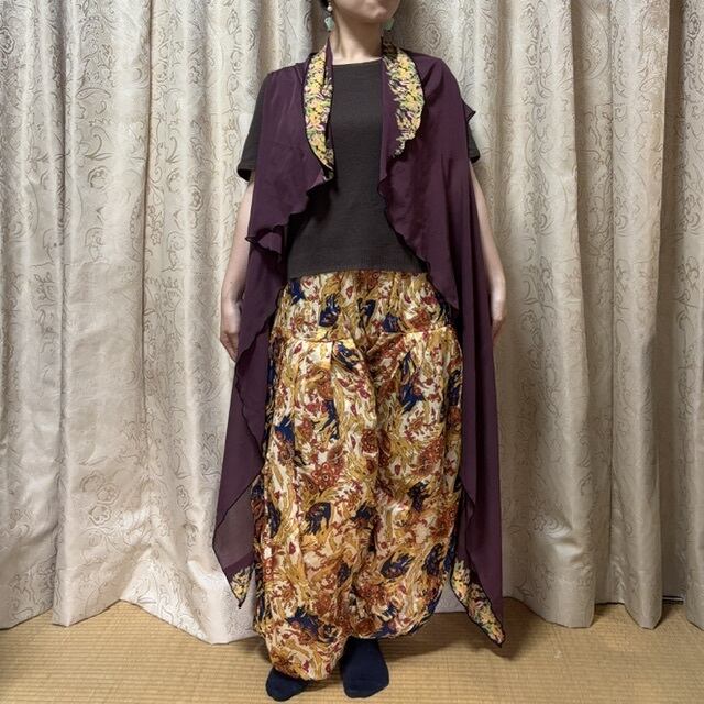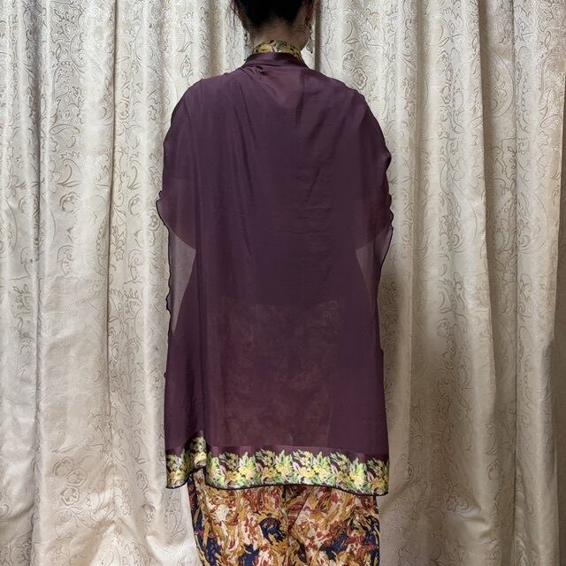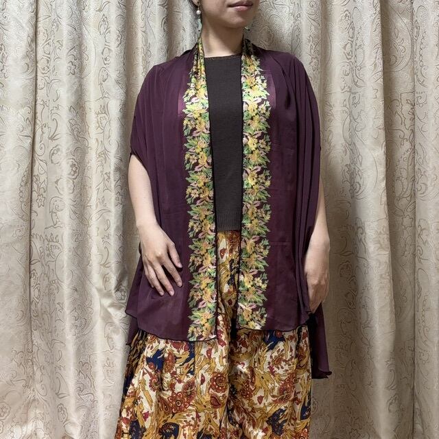 1枚のサリーで仕立てる軽やかなアウターができました。基本の地色は茶色〜ワインレッドのような色で、縁に入ったカラフルなボタニカル柄が印象的。透け感があり涼しげです。無地の部分が多くコーディネートしやすいので、didiで初めてお買い物する方にもおすすめしたい1枚ですが、こういう柄の入り方は珍しいので、もちろんdidiファンの方もぜひ!