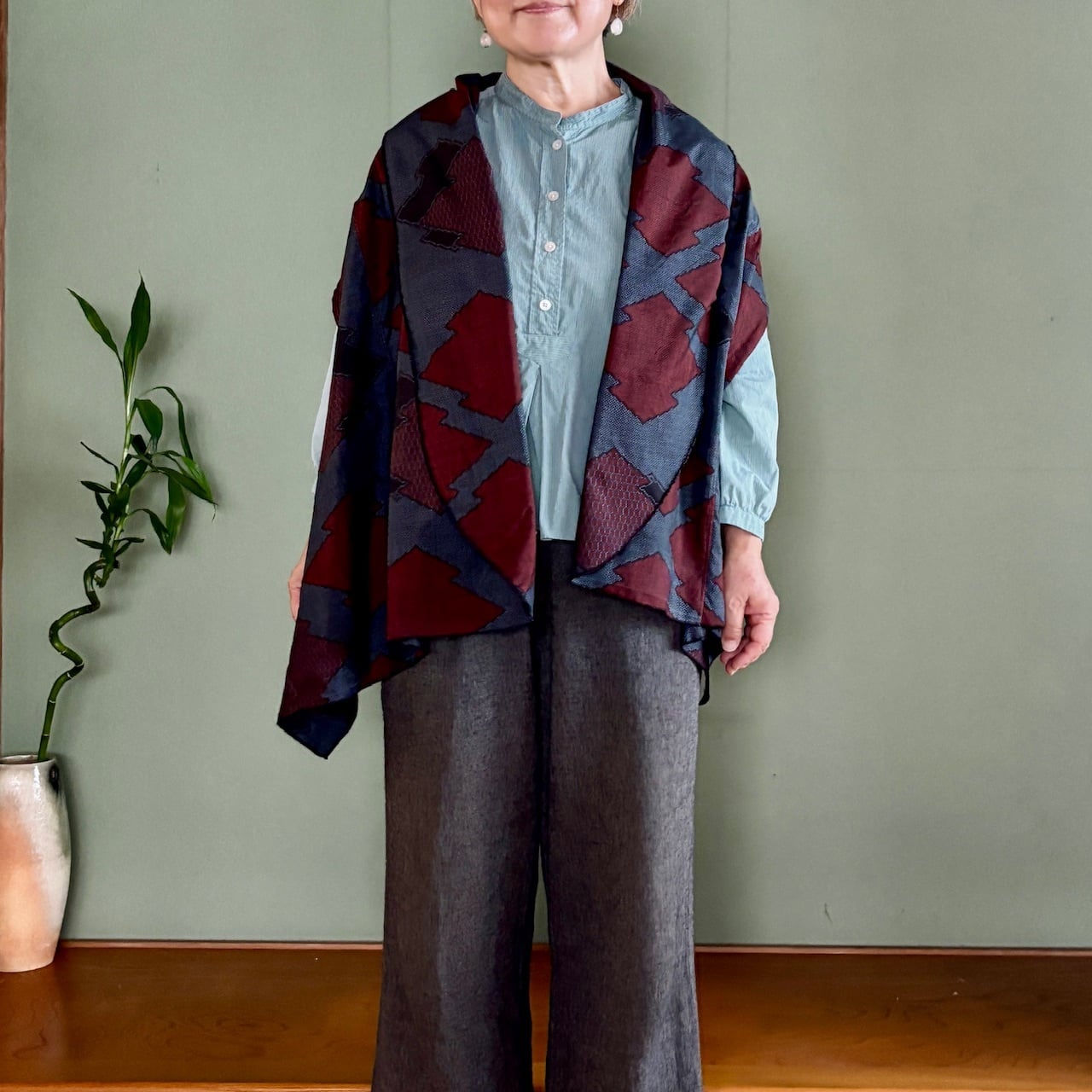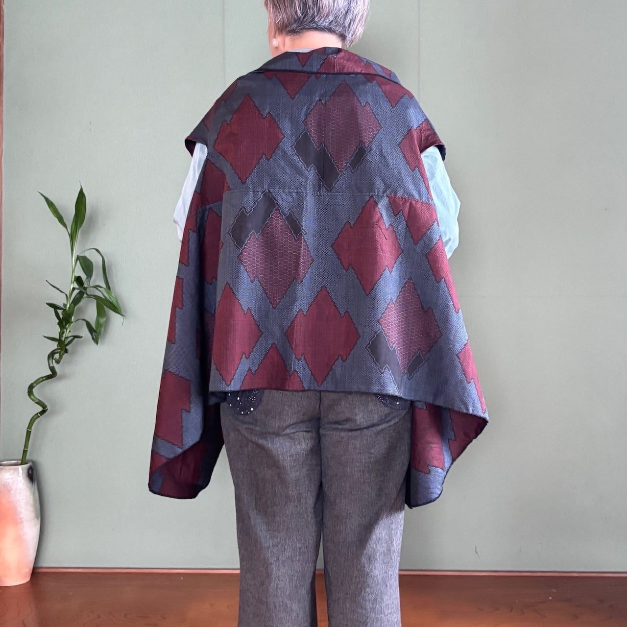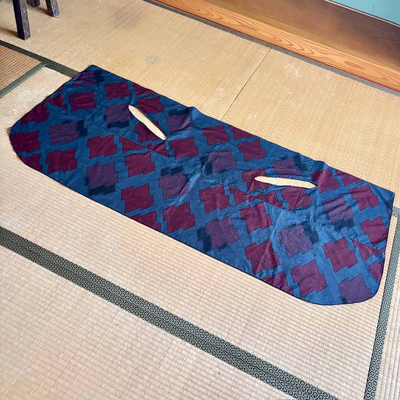大島紬の着物を解いてリメイクしました。濃紺色の地色に暗い赤の3連続の菱形のような形が並んでいます。