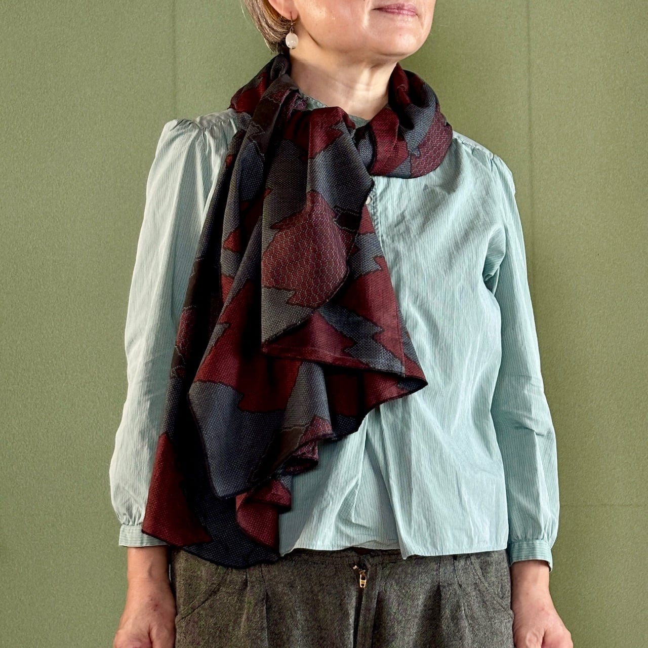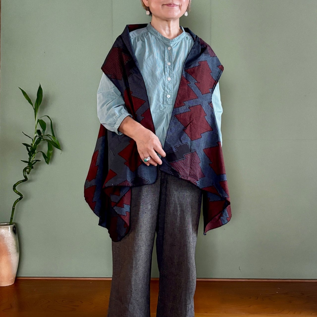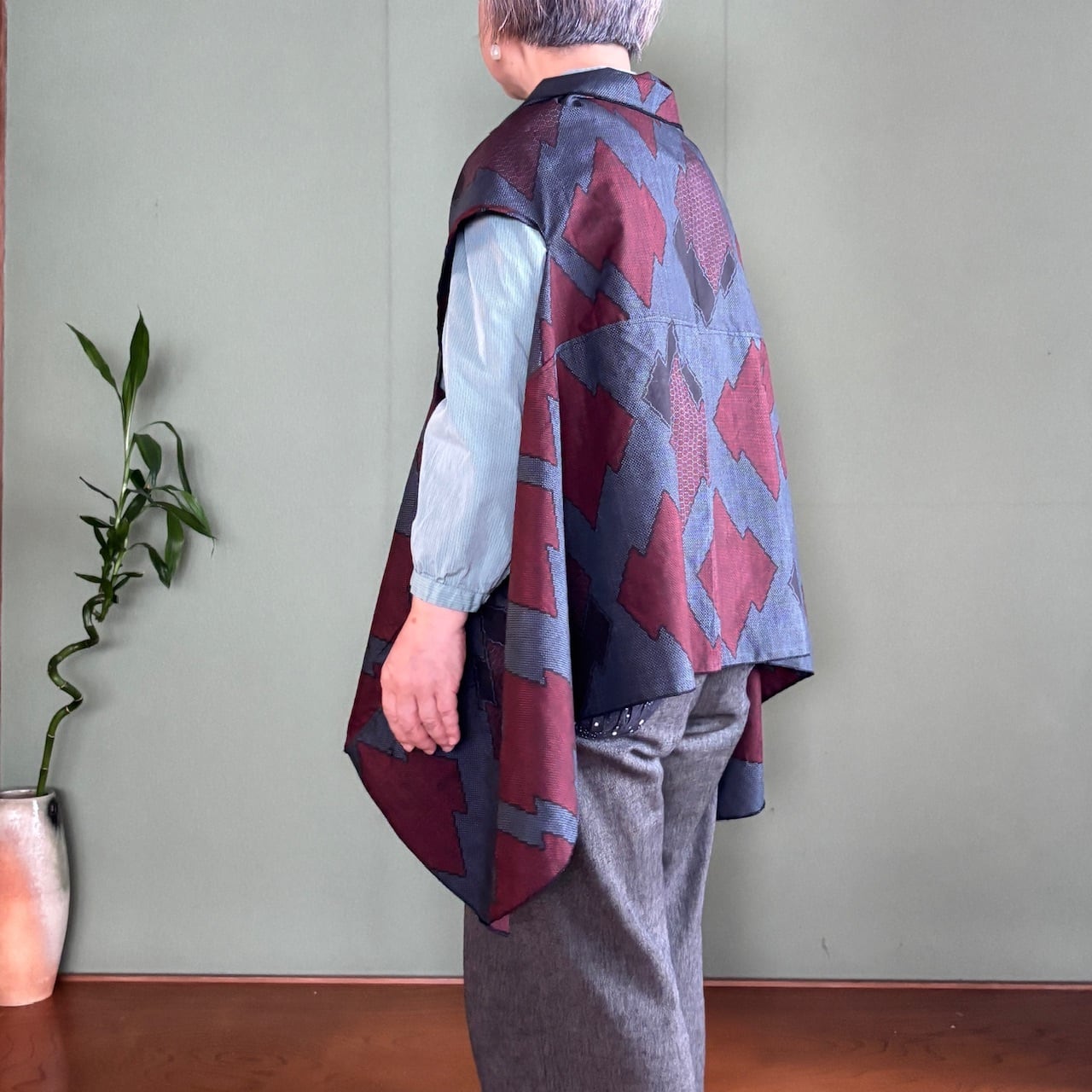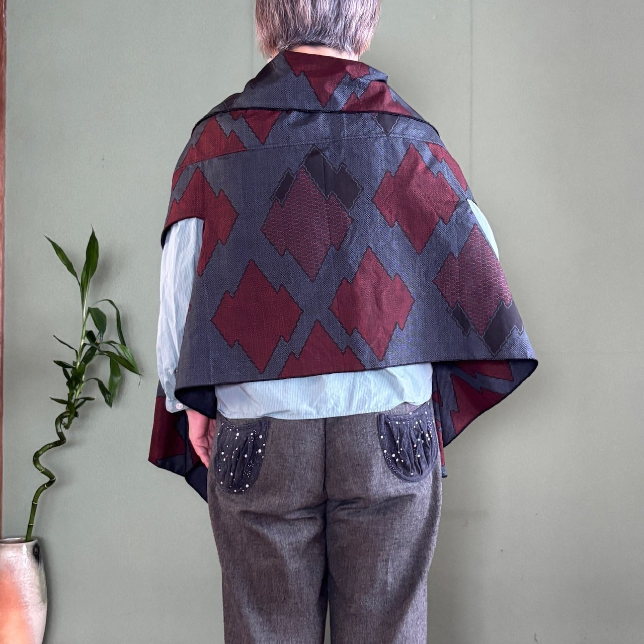 大島紬の着物を解いてリメイクしました。濃紺色の地色に暗い赤の3連続の菱形のような形が並んでいます。