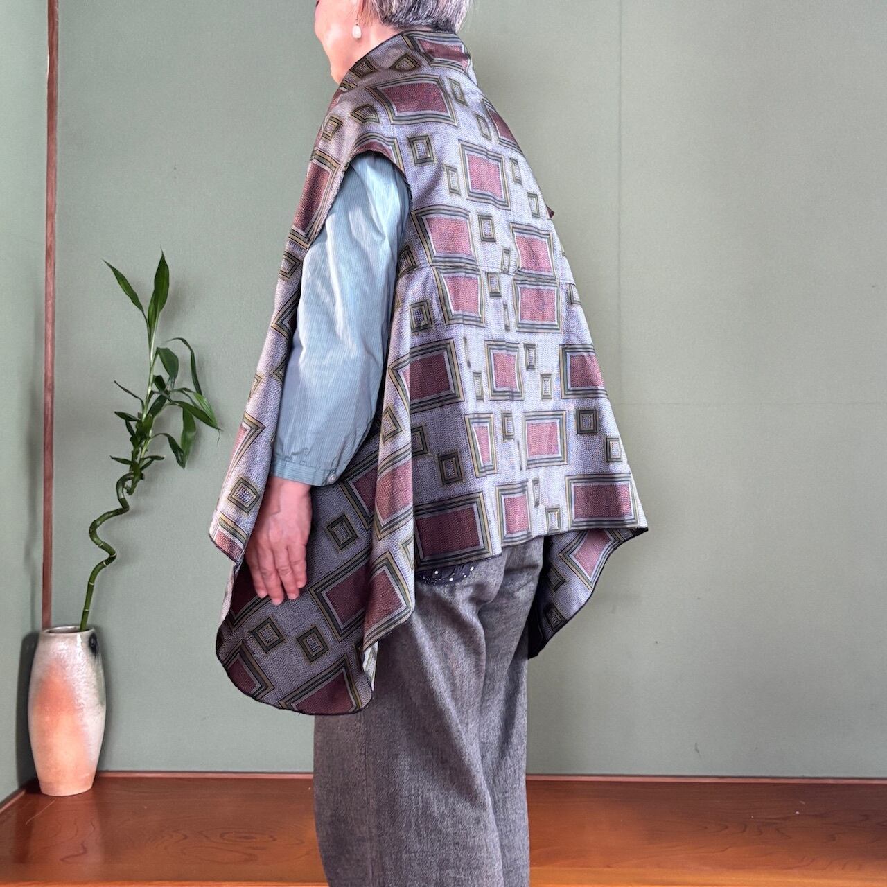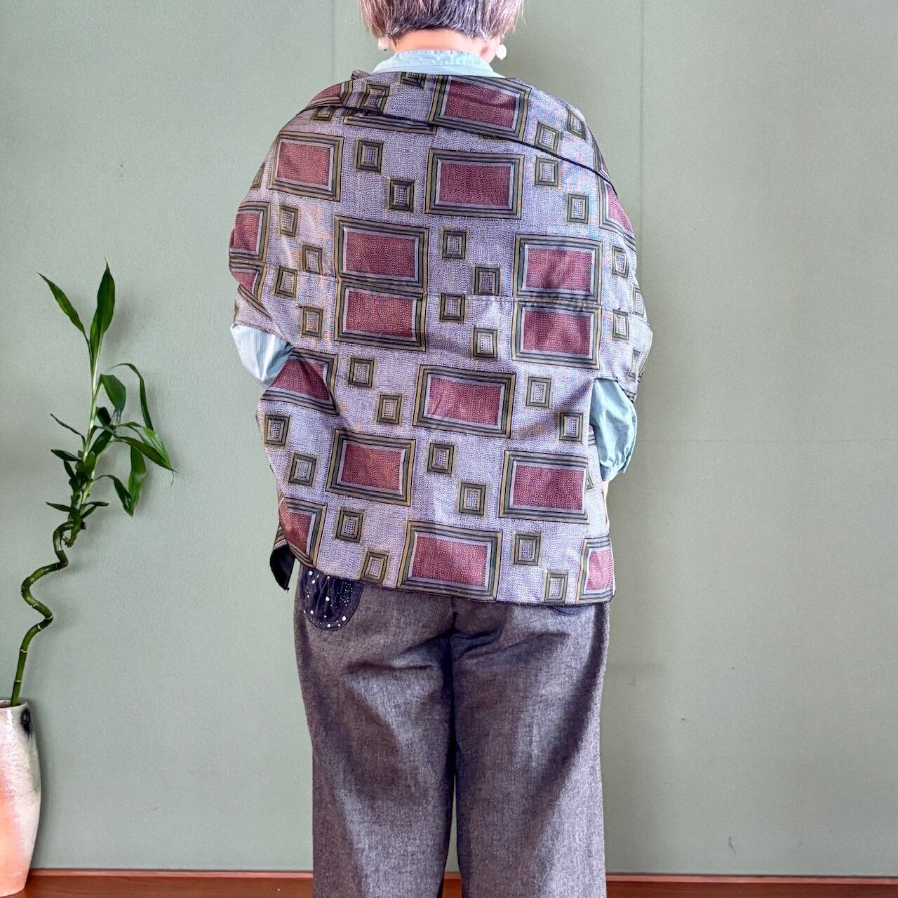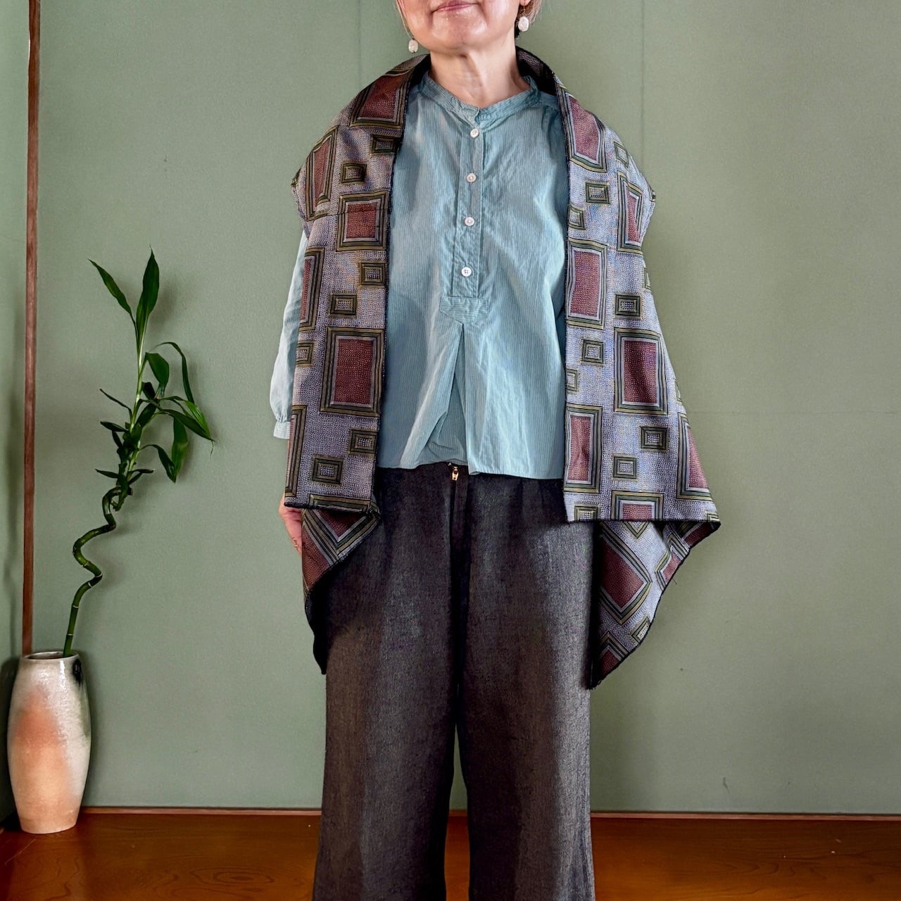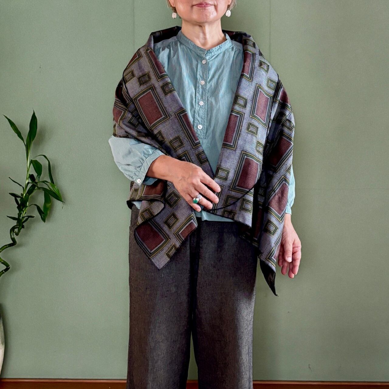 薄く軽い生地ですが、全体にほどよい張りとツヤがあり、羽織るとほどよく立体的なフレアが広がります。スカーフのように首に巻いてもちょうどよいボリューム感です。