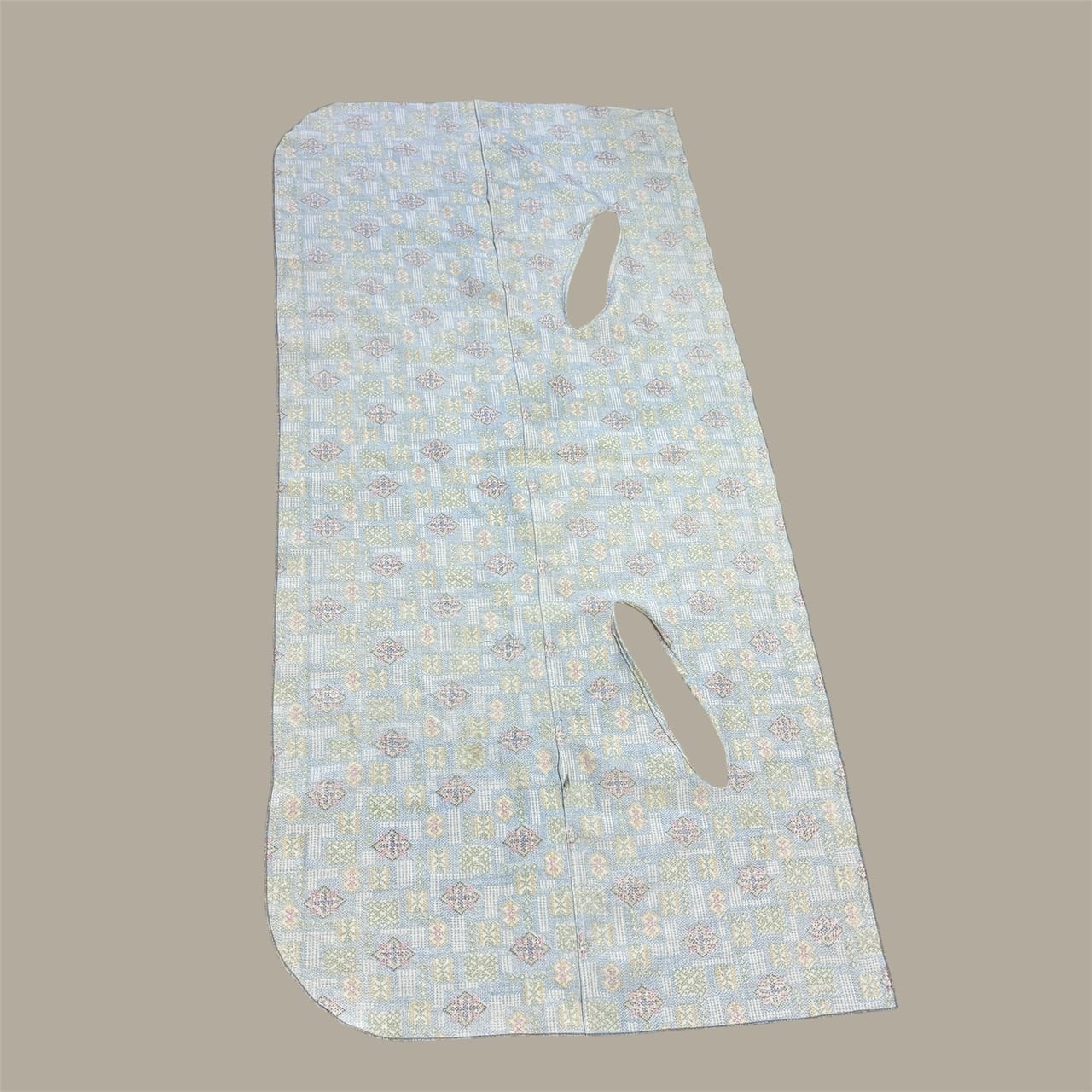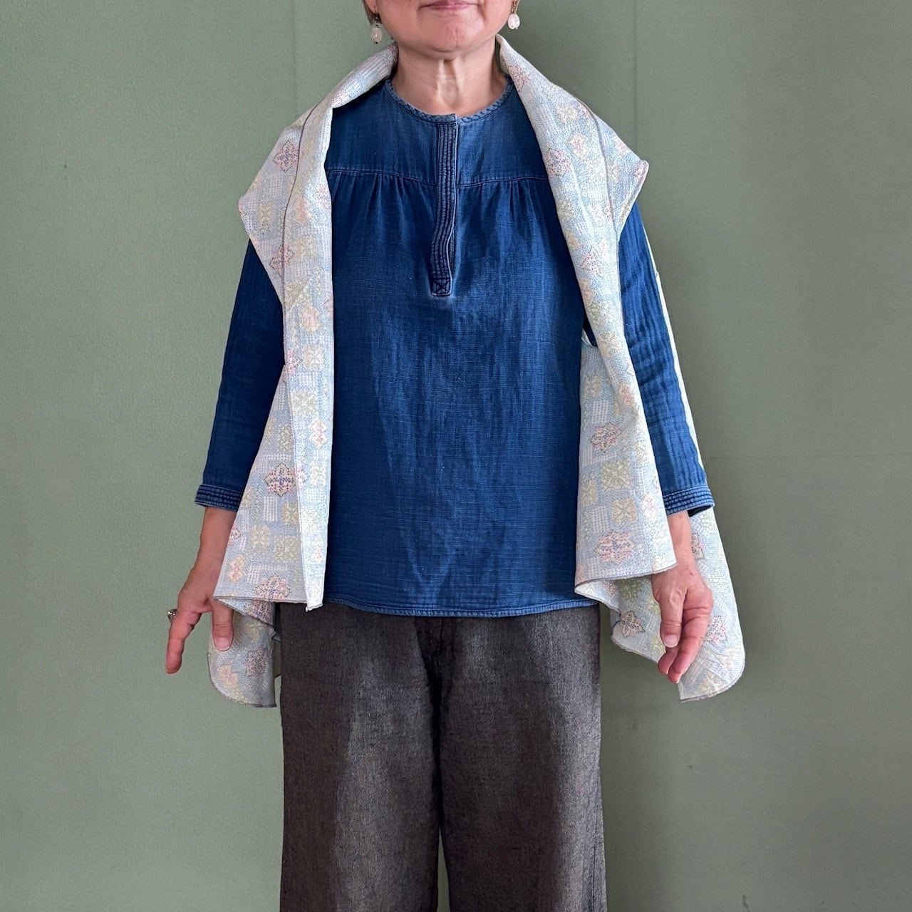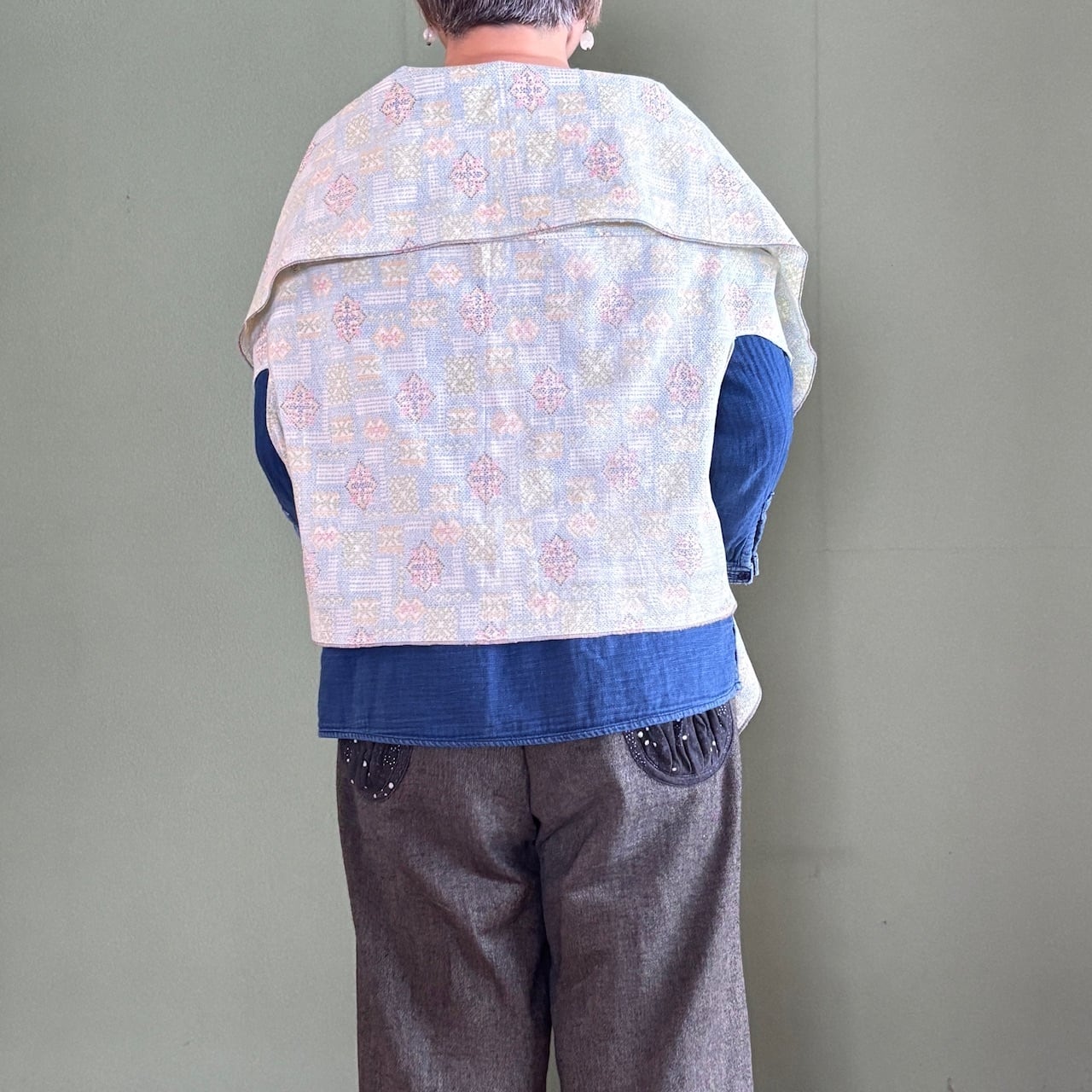淡い空色にタイルのような紋様が並んだデザインです。涼しげな色味とは裏腹に、表面にわずかな凹凸があり暖かみのある生地ですので、防寒としてお召しいただくのも良さそうです。