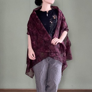 暗い赤みの色合いの、透け感のある「もじり織」の着物の生地をリメイクして、三日月のようなオリジナルショール&アウター「月読」を仕立てました。