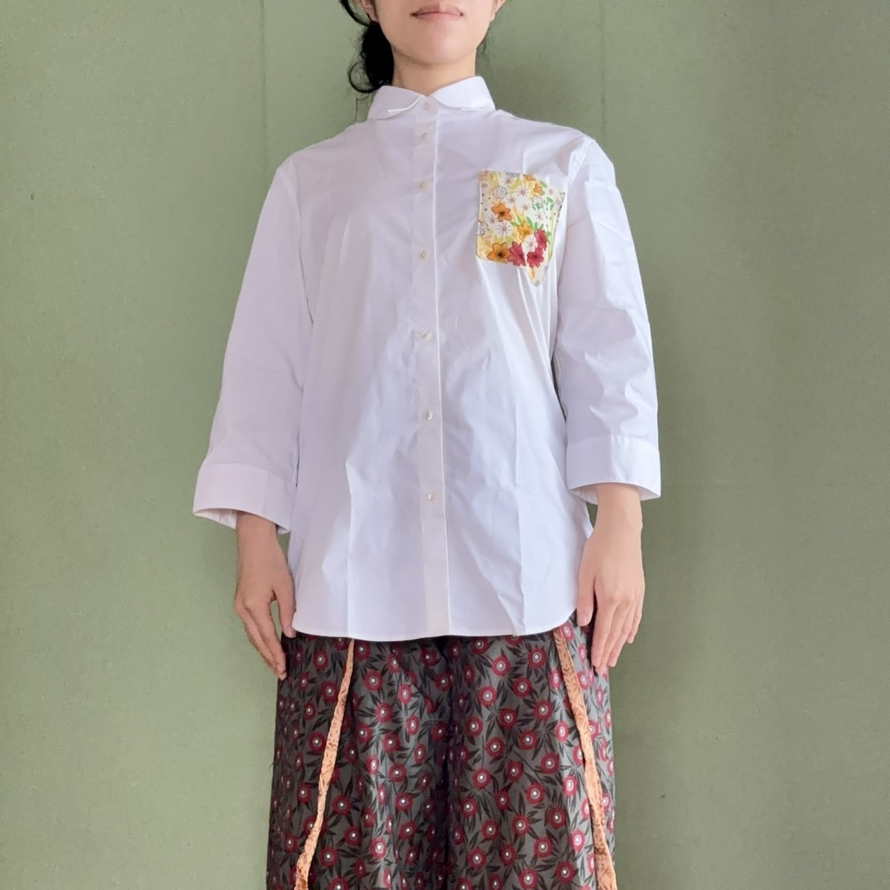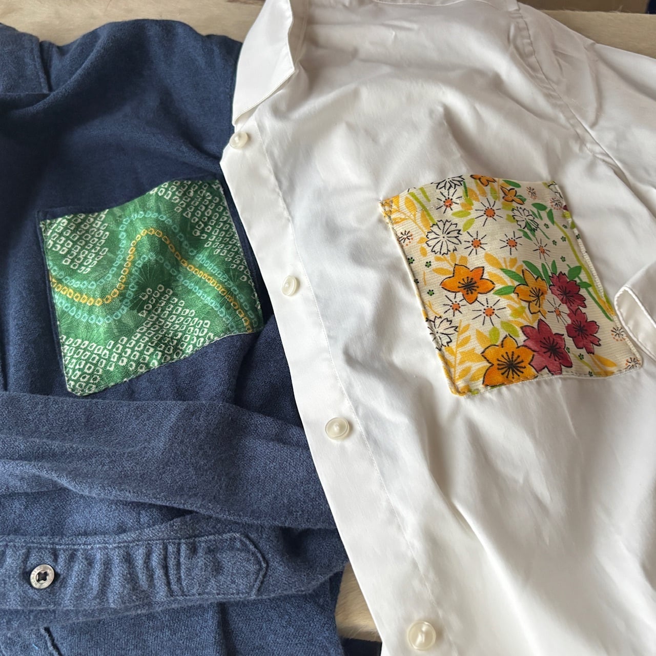 着物地で作ったポケットをあしらった、シンプルなワイシャツです。