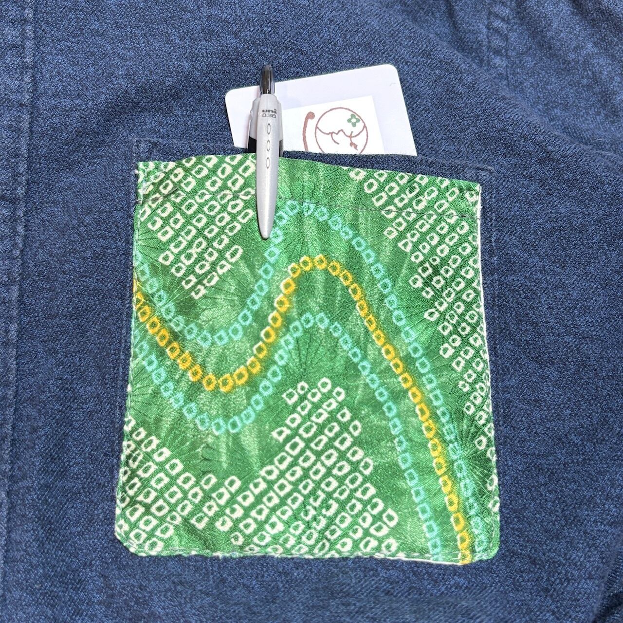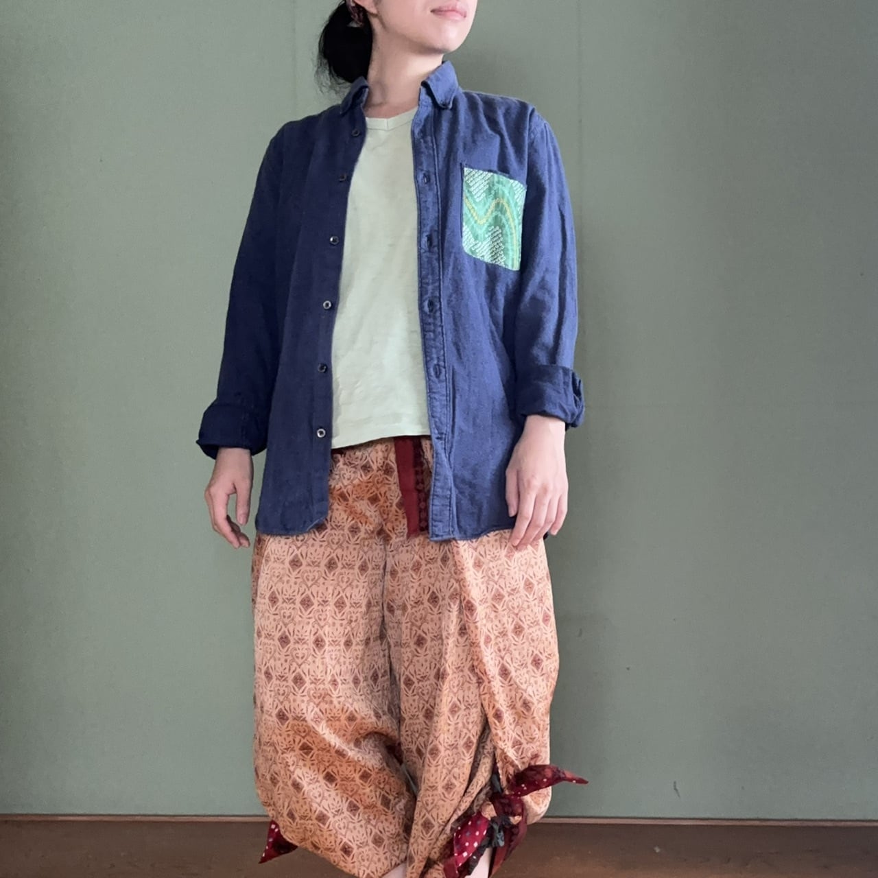 シルクサリーで作ったポケットをあしらった、青いデニムのシャツです。