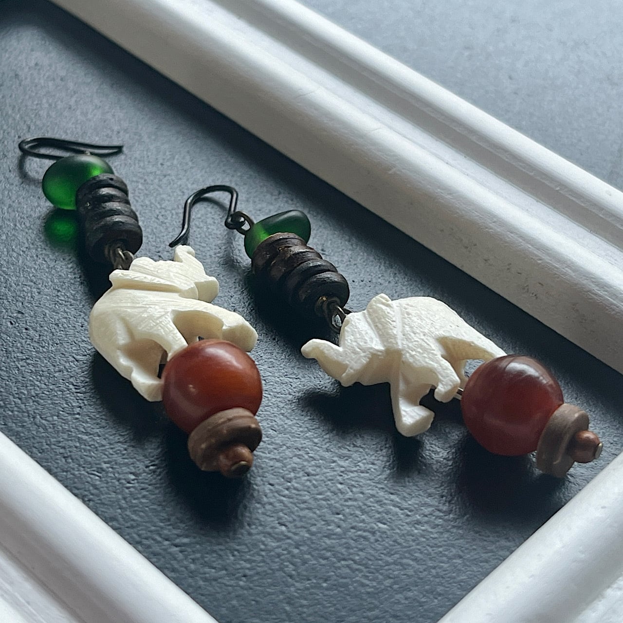 象が乗っている玉のビーズはアンティークのものを使用しております。セルロイドのような半透明〜不透明の落ち着いた色合いです。