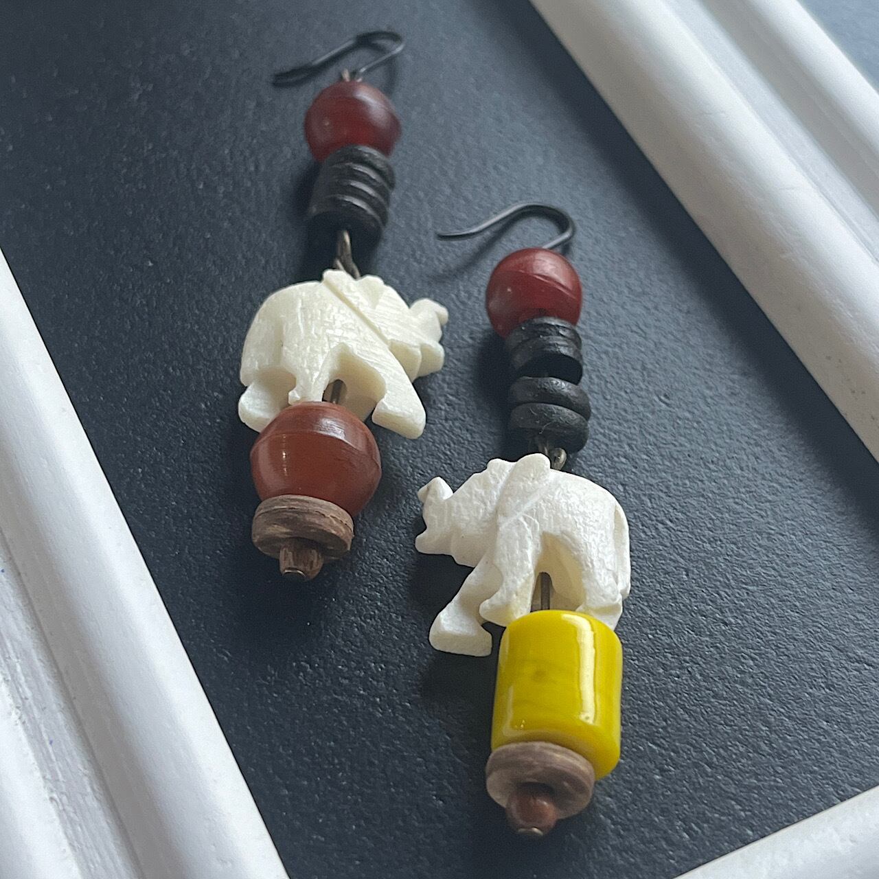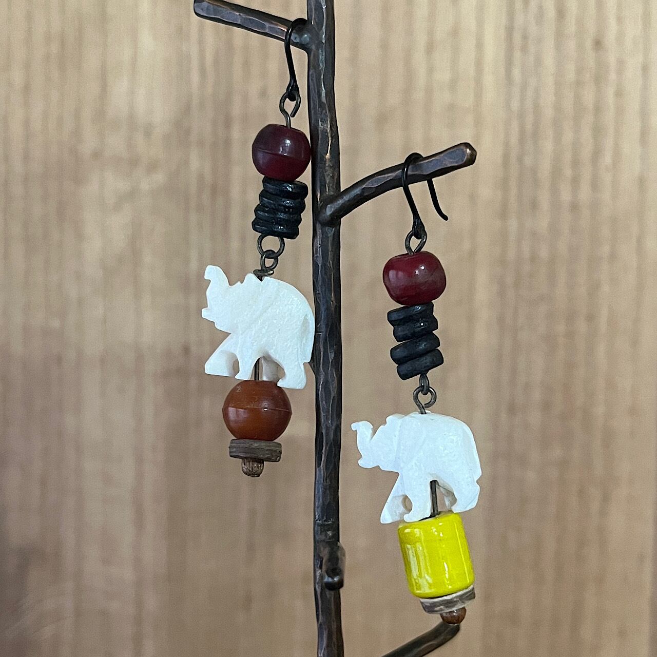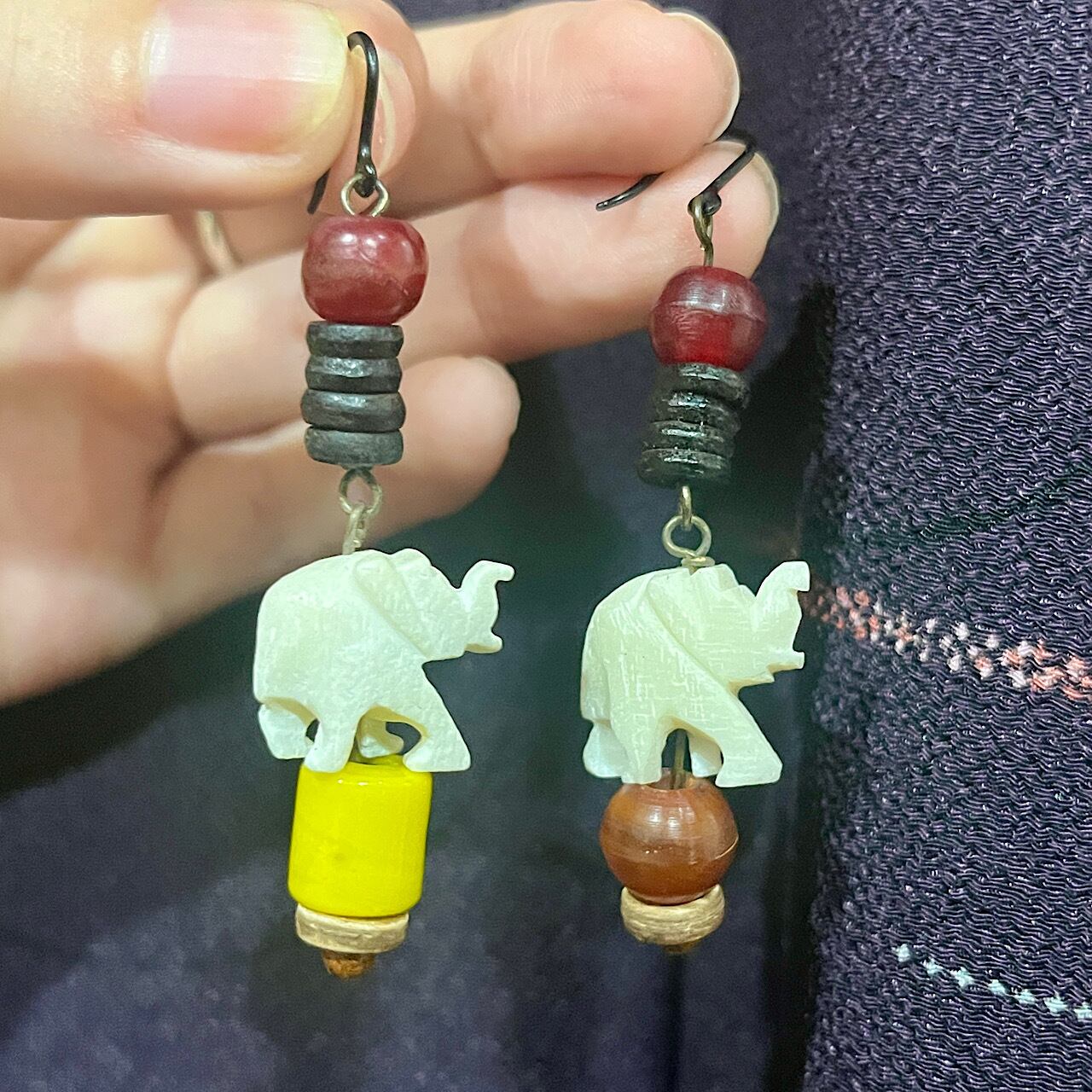 片方の象が乗っている玉のビーズと一番上のビーズはアンティークのものを使用しております。セルロイドのような半透明〜不透明の落ち着いた色合いです。