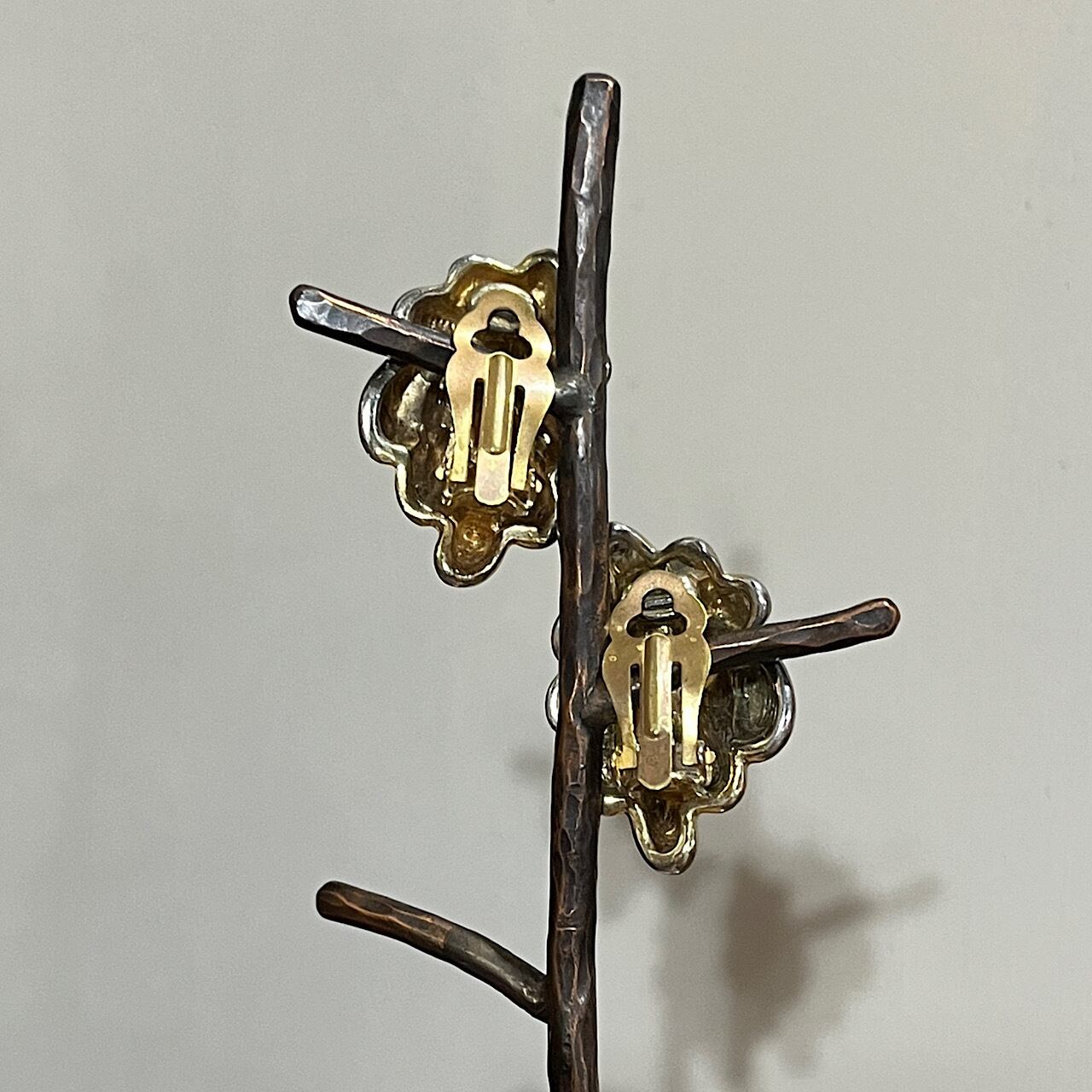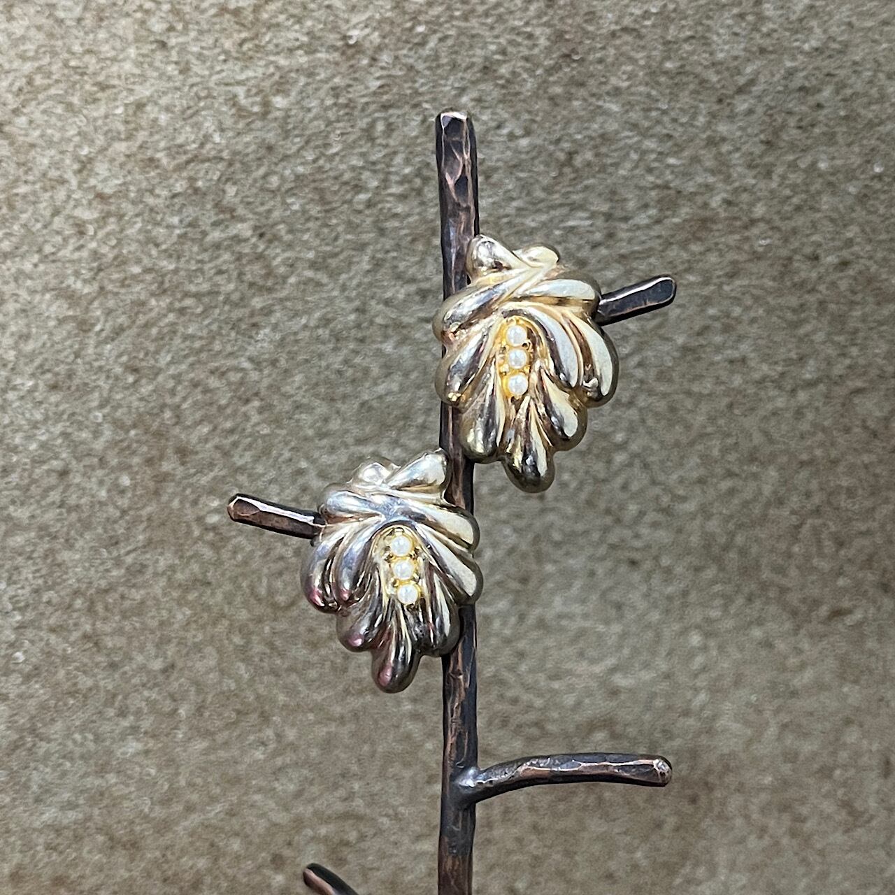 大きな房の花のような形の、金色のイヤリングです。