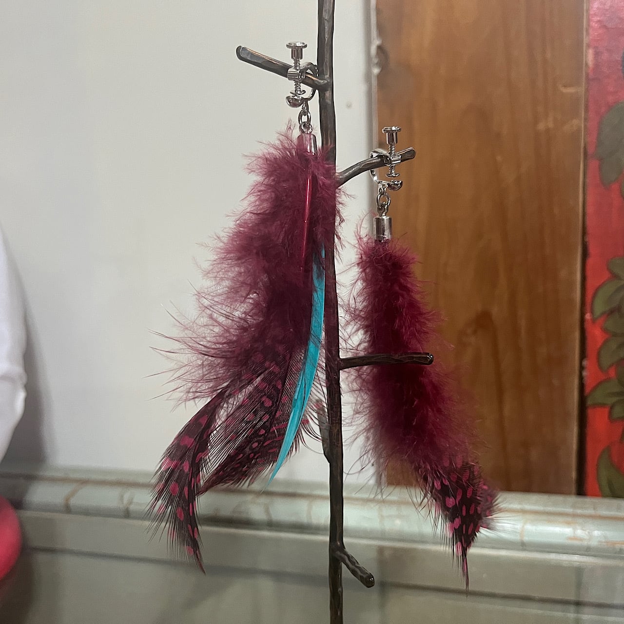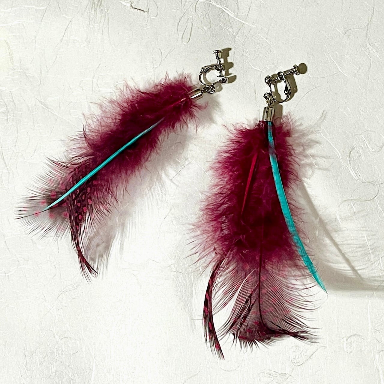 ホロホロ鳥とガチョウの羽を使ったイヤアクセサリーです。