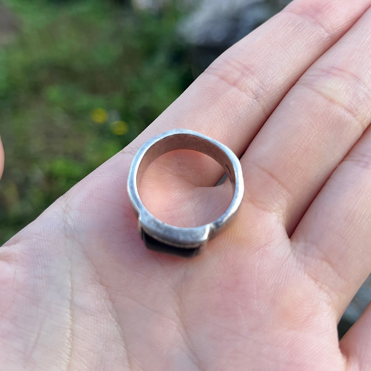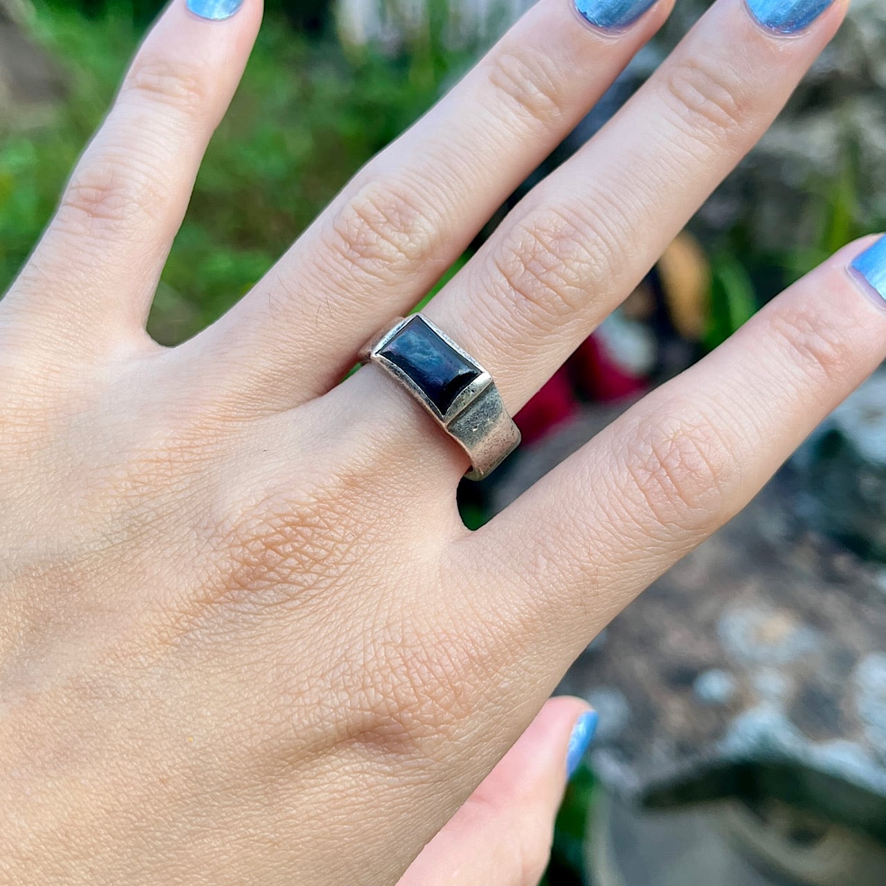 美しいラブラドライトを使用したアンティークの指輪です。光の加減によって色彩が変化する神秘的な石をお楽しみいただけます。